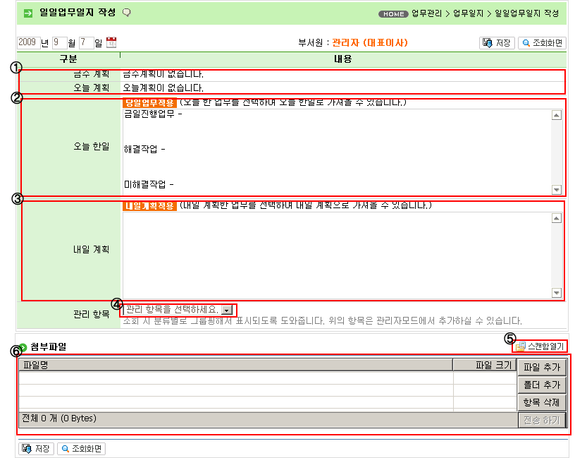 회사 전체의 업무일지를 보다 효율적이게 사용하기 위하여 관리항목을 두어 카테고리 별로 볼 수 있습니다.